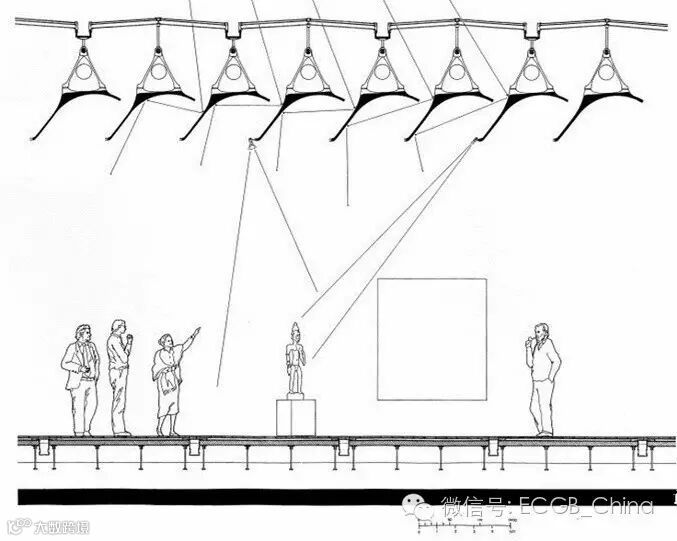 这样的反光方式最常用在美术馆、博物馆这种对直射光比较反感的空间之中,通常采用屋顶采光的方式: