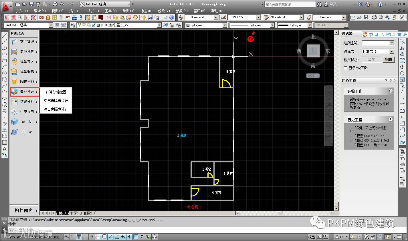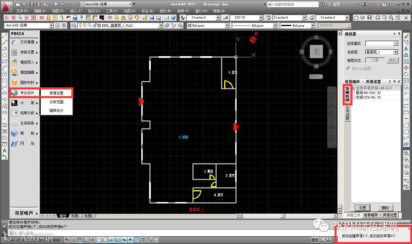 PKPM-SoundIn实现BIM理念,用设计模型。软件直接导入PKPM绿建系列软件统一的数据模型,设置好构件材料信息,直接进行公式法或类比法的计算,大大提高工作效率。