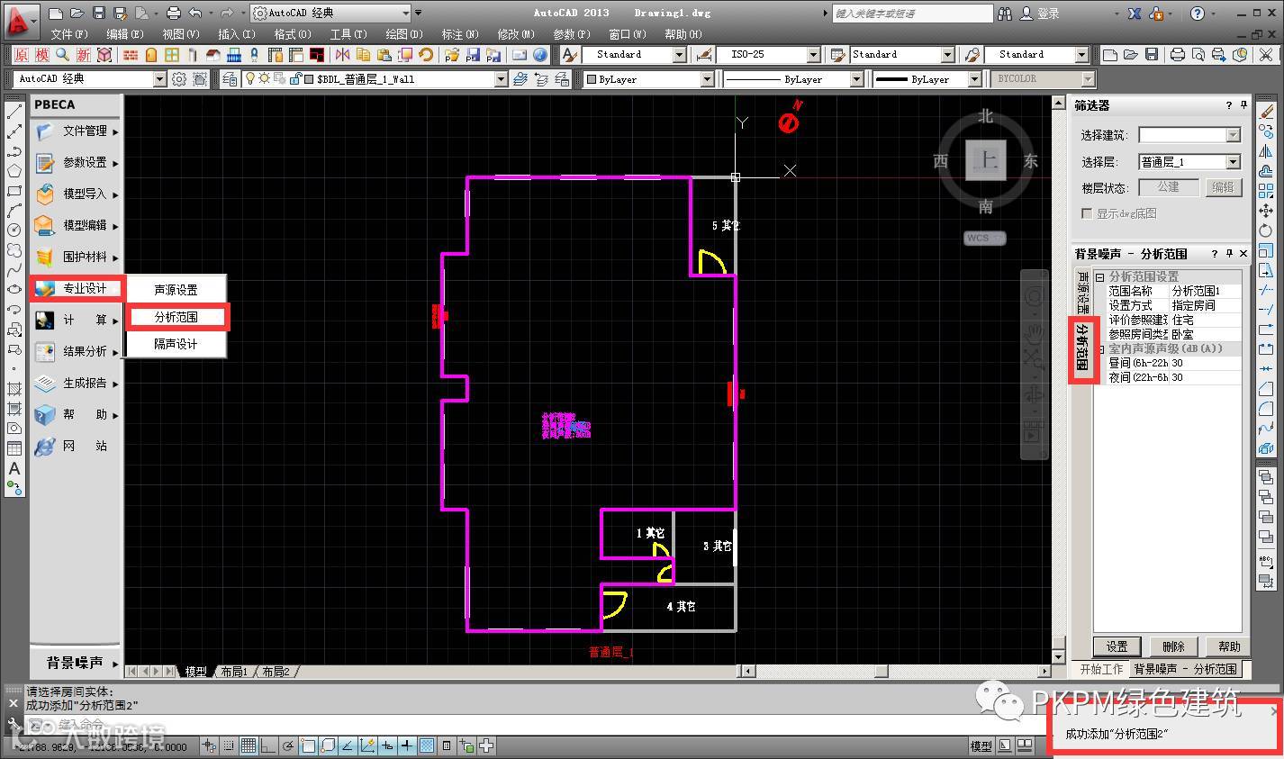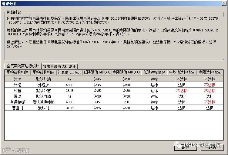 PKPM-SoundIn的背景噪声模块,软件可以灵活根据用户自定义来设定分析范围,通过设定评价参考建筑类型,对参照房间进行达标判断。