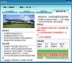 PKPM绿色建筑及节能系列软件任意一款产品启动之后均会展现今日动态界面,产品厂商公司介绍、产品介绍、工程实例展示等重要信息在醒目位置进行展示和推广,并衔接产品企业公司网站链接和业务联系方式。