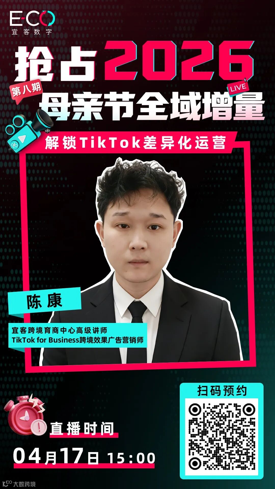 4月17日(本周五)下午15:00-17:00,《宜起聊跨境》系列直播第8期火热继续!我们将带你抢占2026母亲节全域增量,从选品到内容再到执行SOP,让TikTok差异化运营真正落地。