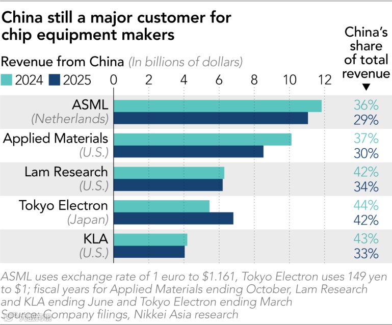 对于ASML而言,中国市场在2025年的收入占比为29.1%;而日本龙头Tokyo Electron该比例在2025财年超过40%。