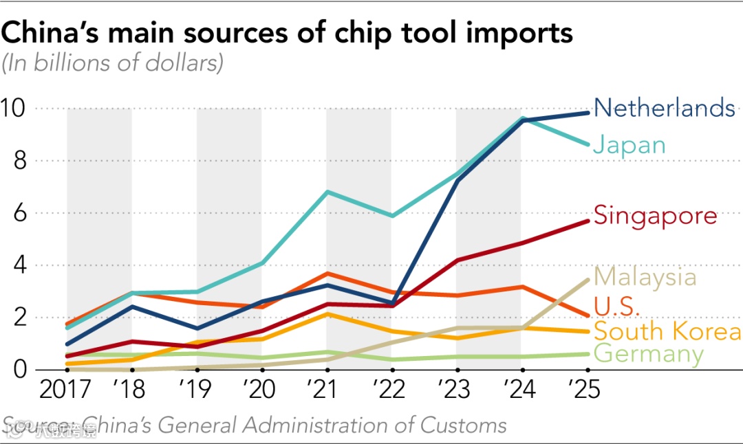 日本机构的一项分析显示,2025年中国从马来西亚和新加坡进口的半导体制造设备大幅增长,已超过自美国的进口额;而美国对华相关出口则降至八年来最低水平。
