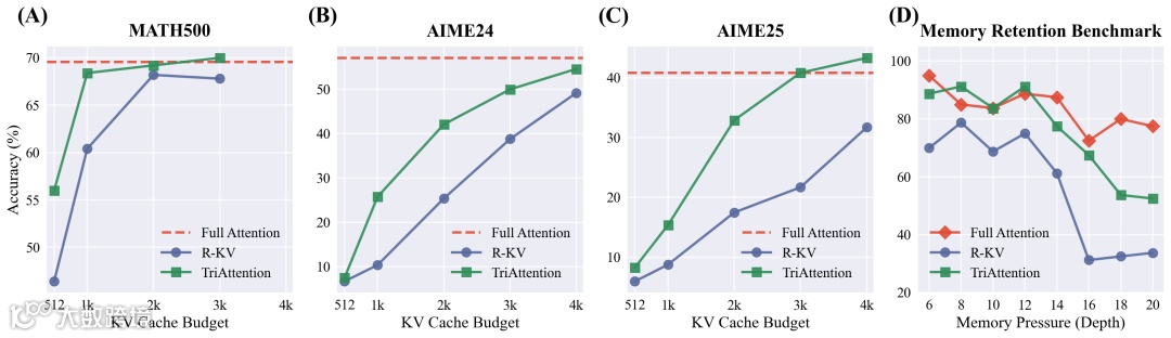 MATH 500:只用1024个token的KV预算,TriAttention达到56.0%,接近全量注意力的69.6%。