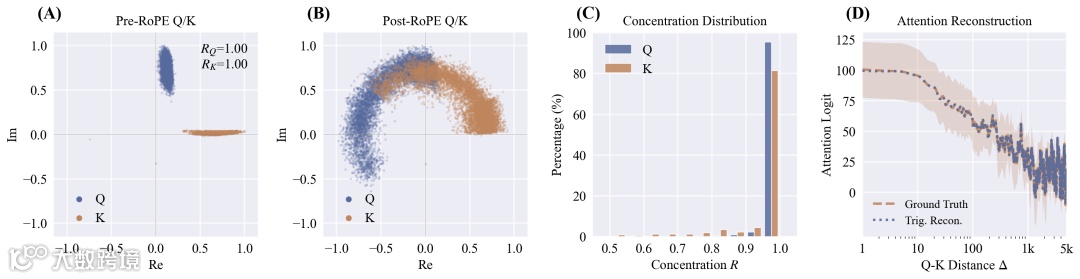 ▲ Q/K集中现象:(A)RoPE前高度集中 (B)RoPE后分散 (C)集中度分布 (D)注意力重建