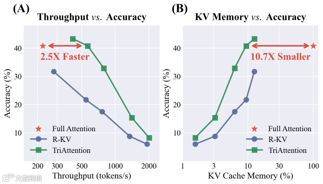 实验效果很扎实:在AIME25上,TriAttention匹配全量注意力的准确率,同时吞吐量提升2.5倍,KV内存减少10.7倍。而对比方法R-KV在相同效率下只有一半准确率。
