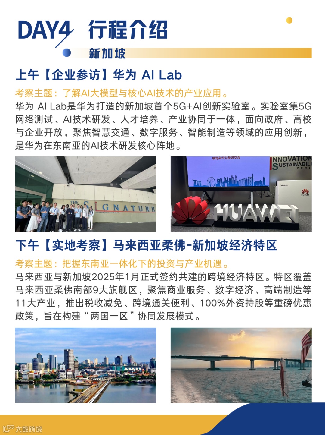 ✅Day4:上午走进华为新加坡 AI Lab,看5G+AI技术创-新应用;下午实地考察柔佛 - 新加坡经济特区,把握东南亚产业新机遇