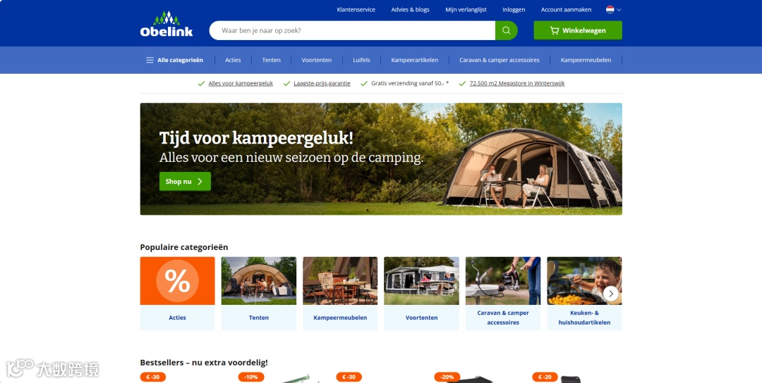 Obelink是欧洲头部户外露营垂直电商平台,1959年由Jan Obelink创立,总部位于荷兰,是欧洲露营、房车、户外装备领域的标杆零售平台。
