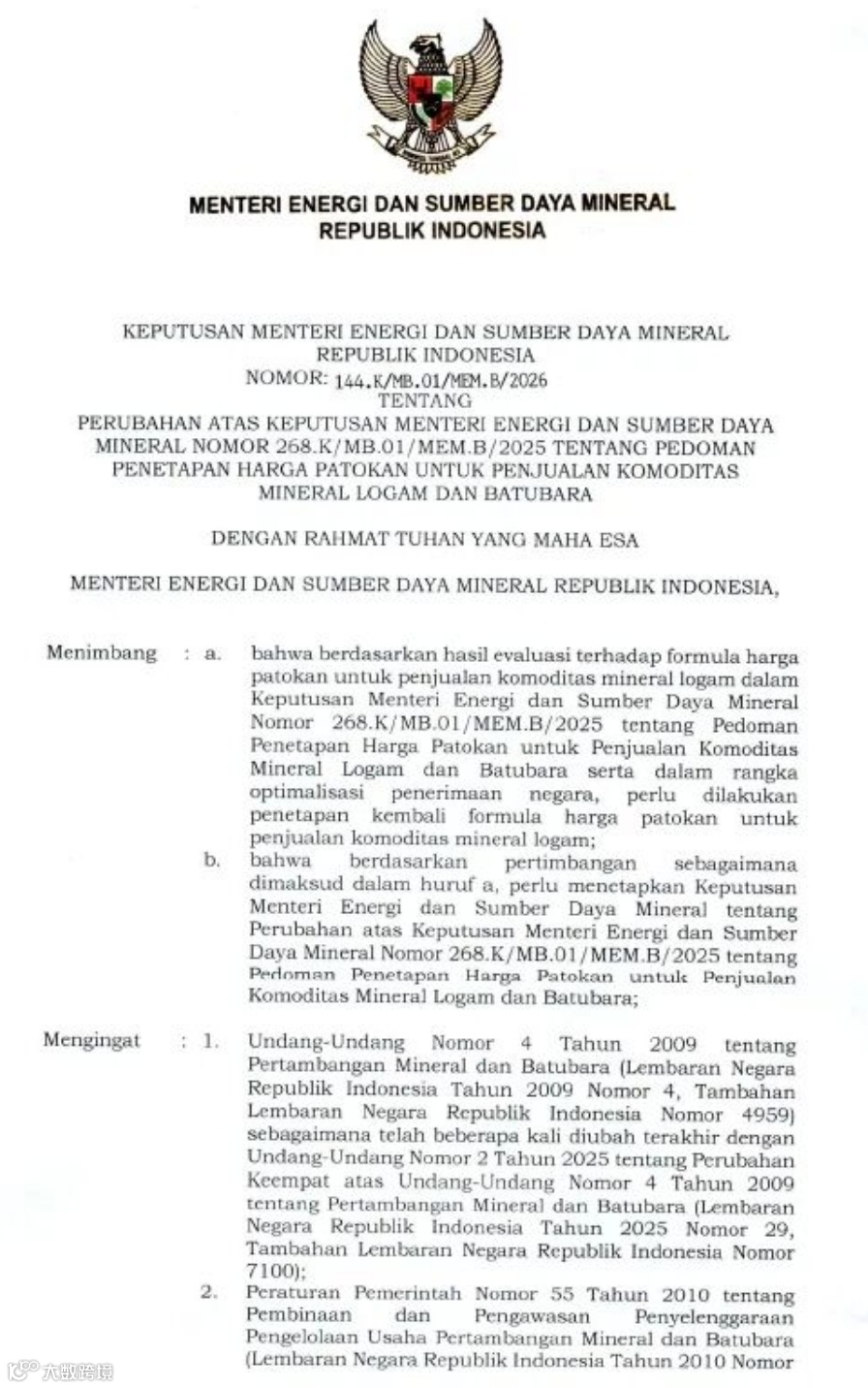 2026年4月15日,印尼能源与矿产资源部(ESDM)修订的镍矿矿产基准价(HPM)测算新规正式实施。该政策首次将钴、铁等伴生矿纳入计价体系,并重构修正系数机制,标志着印尼镍矿定价告别单一镍元素模式,进入多元素综合估值新阶段。作为拥有全球41.9%镍矿储量及60%以上产量的资源重地,印尼的政策调整直接影响中国新能源企业(电池、冶炼等)的供应链稳定与出海战略。