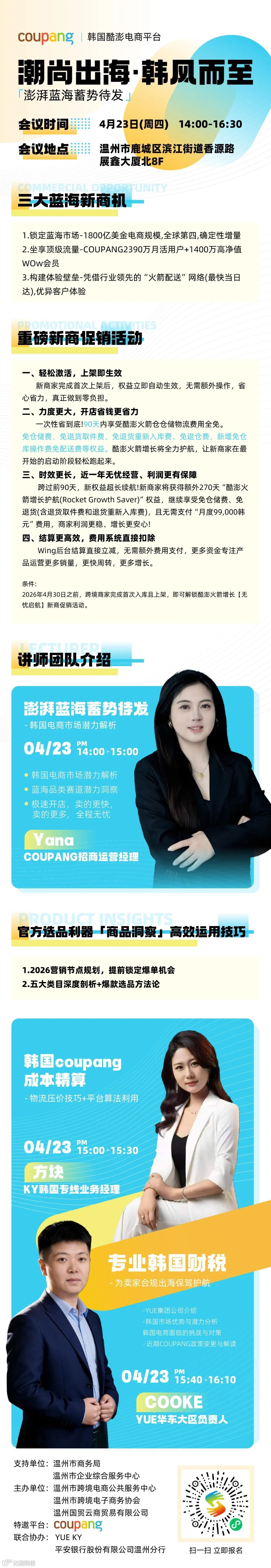 活动报名 | 从选品到开店,一站式布局Coupang!4月23日温州专场,深度解析韩国蓝海商机!