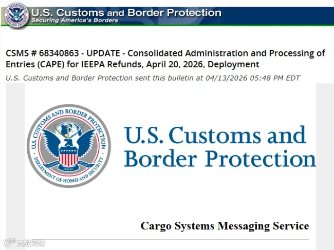 美国海关和边境保护局(CBP)宣布,针对依据《国际紧急经济权力法》(IEEPA)征收的关税,将于4月20日正式启用自动化退款处理系统(CAPE)。