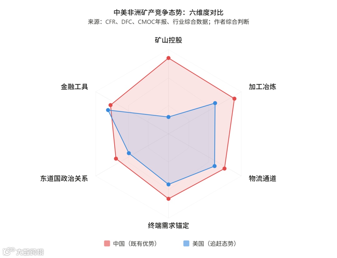 此模式凸显根本差异:中国"基建换资源"需长期建设投入(Sicomines协议15年仅落实8.22亿美元),美国"安全换资源"针对刚果(金)东部冲突痛点提供即时价值。