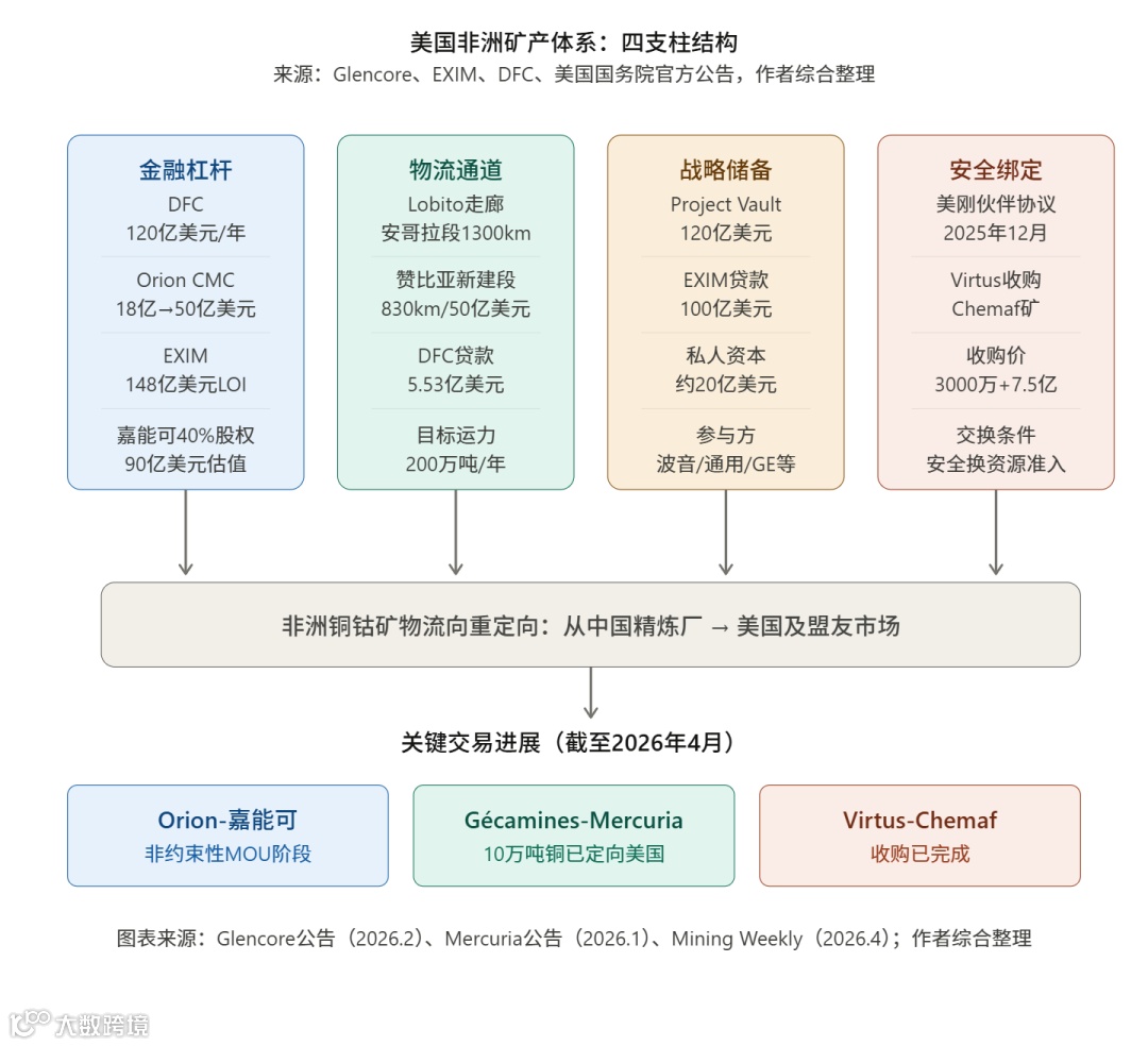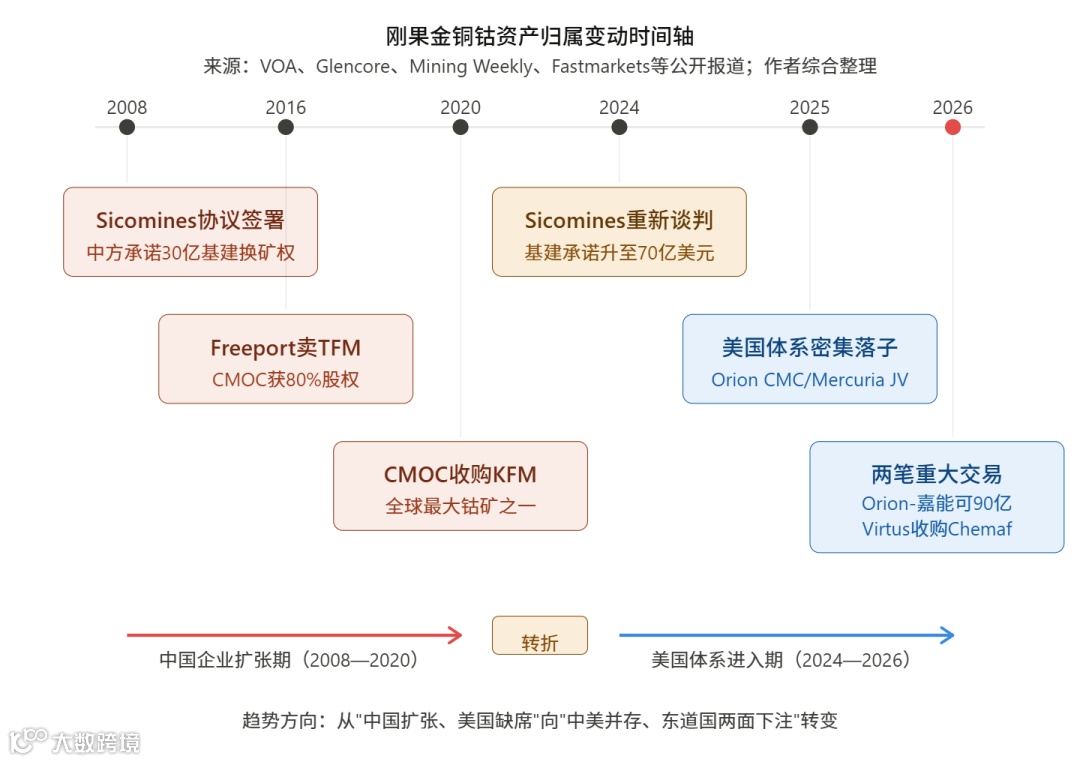 关键进展:2026年2月,OrionCMC与嘉能可签署谅解备忘录,拟以90亿美元估值收购其刚果(金)Mutanda矿及Kamoto铜业40%股权。交易若落地,将获得董事会席位及产量定向销售权,实现"矿方运营、美国控流"的模式。