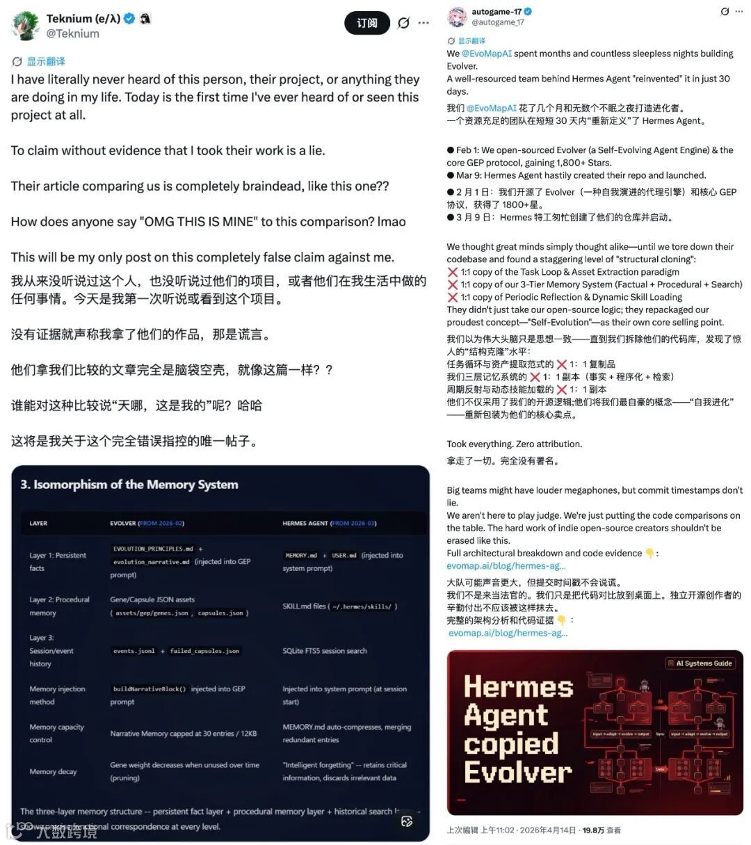 Hermes Agent 被指架构抄袭后回应:听都没听说过、对比文章「完全没有脑子」