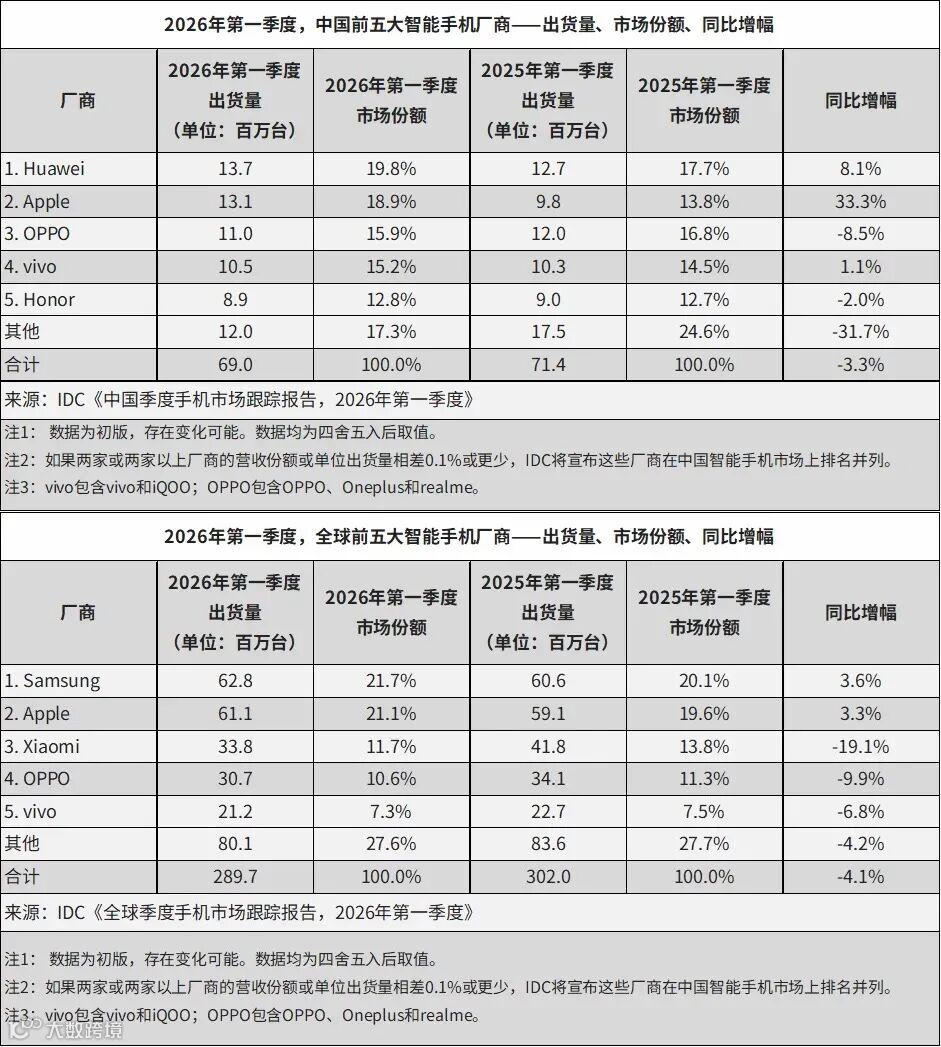 Q1 全球智能手机出货量十季度来首降,三星苹果是前五中仅有的赢家