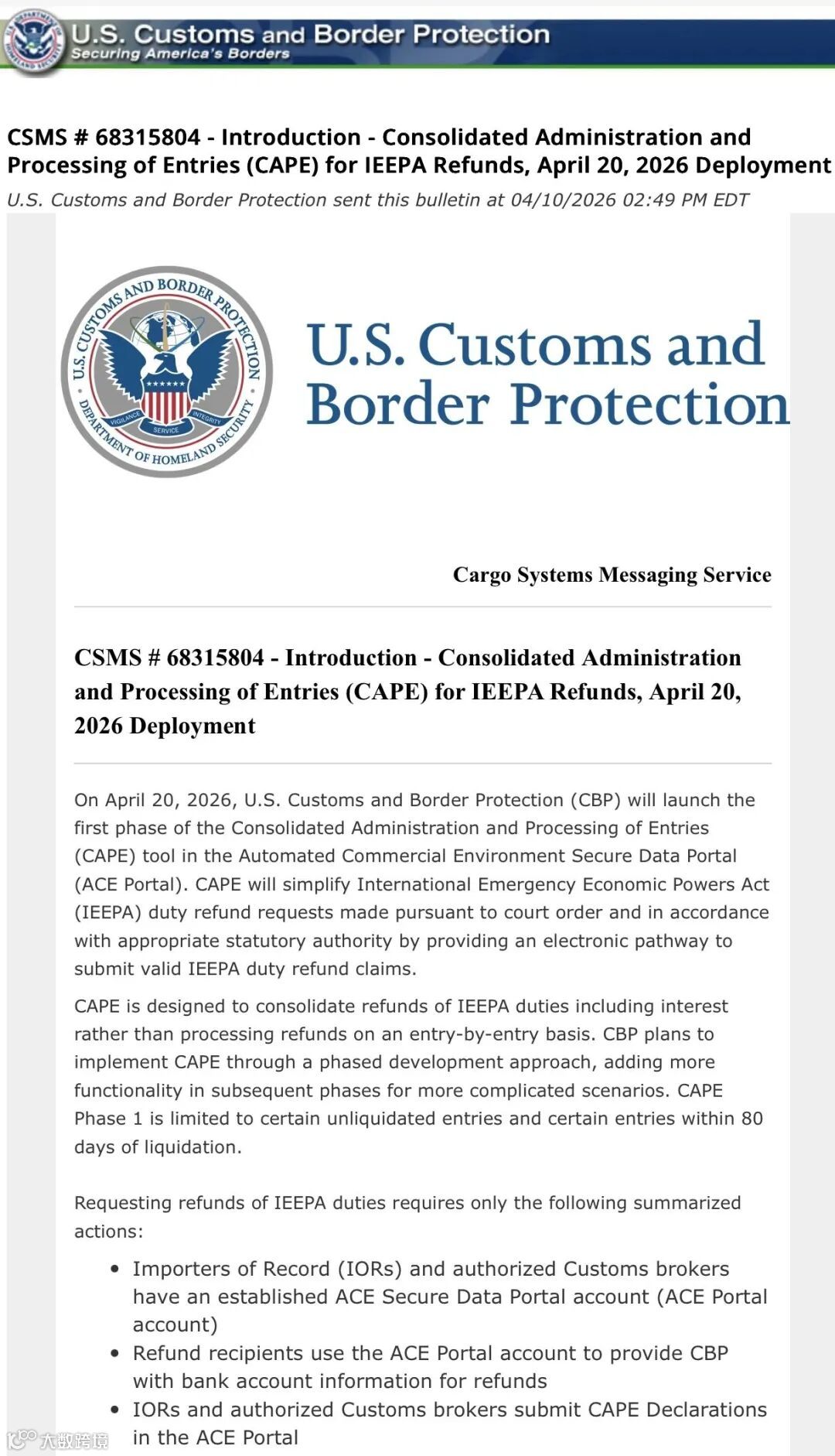美国海关与边境保护局(CBP)发布公告,此前依据《国际紧急经济权力法》(IEEPA)征收的关税,将于2026年4月20日启动退款流程。退款依托CAPE自动化系统处理,该系统集成于CBP的ACE Portal门户,支持进口商或授权报关行批量提交申请,实现集中审核与统一退款。