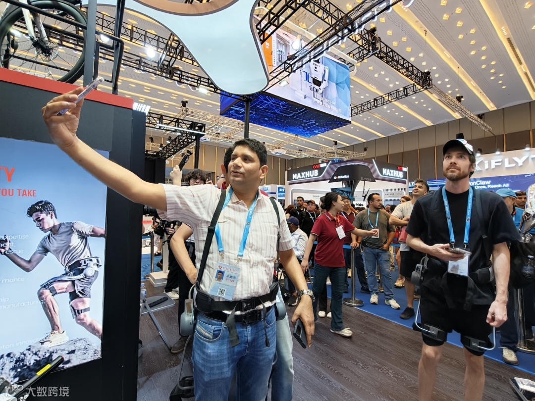 首期展览面积达52万平方米,展位超2.5万个,约1.2万家企业集中展示电子家电、工业制造等五大板块。智能穿戴专区中,海外客商体验腰部助行外骨骼产品后盛赞不已。