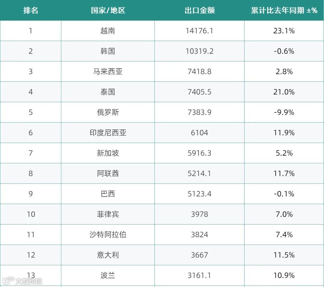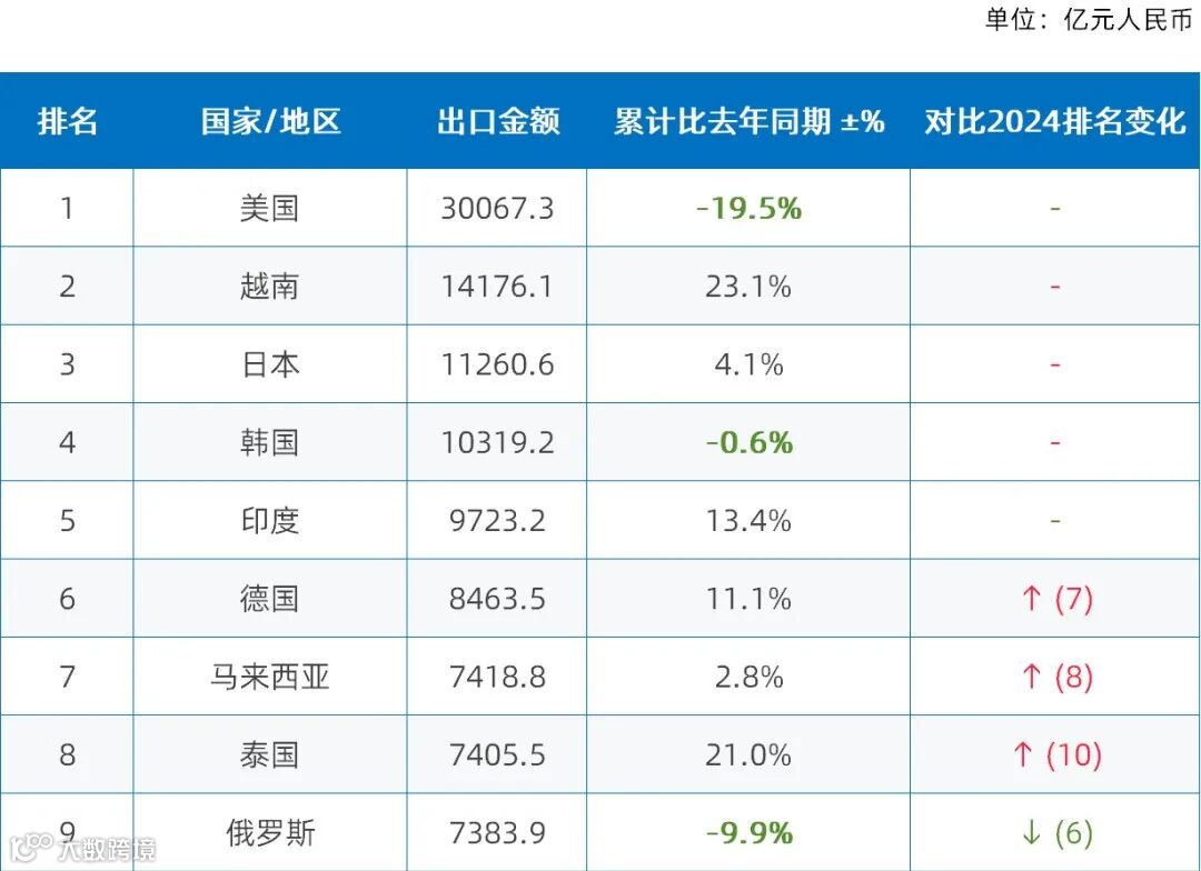 2025年对外出口国家榜单