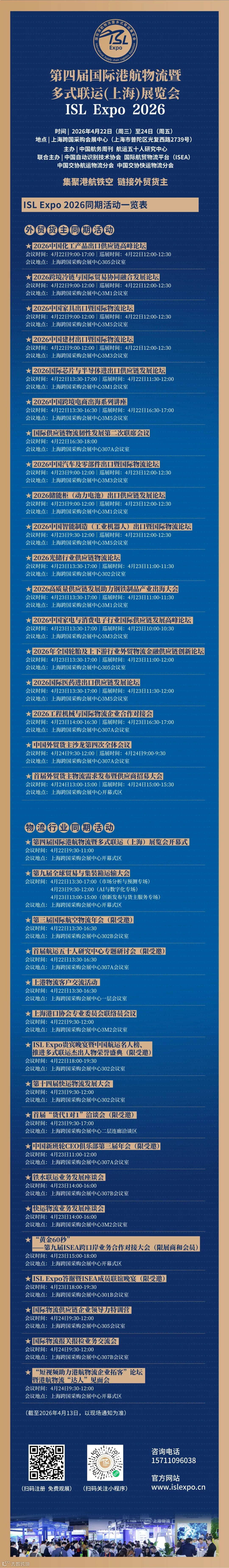 第四届国际港航物流暨多式联运(上海)展览会(ISL Expo 2026)将于2026年4月22日-24日在上海跨国采购会展中心举行。展会由中国航务周刊、航运五十人研究中心主办,定位于"集聚港航铁空,链接外贸货主",打造供应链各方对话外贸货主的高端平台,总展览面积20000平方米,预计吸引专业观众25000人,其中外贸货主买家3000人。