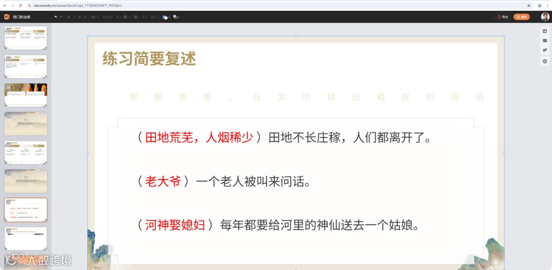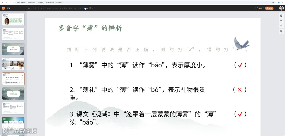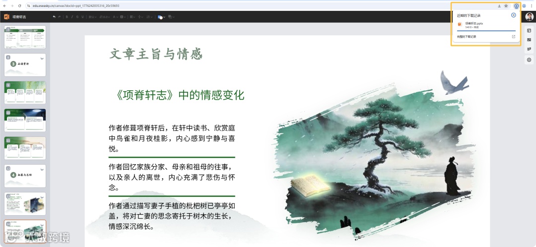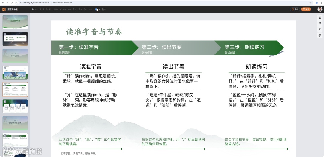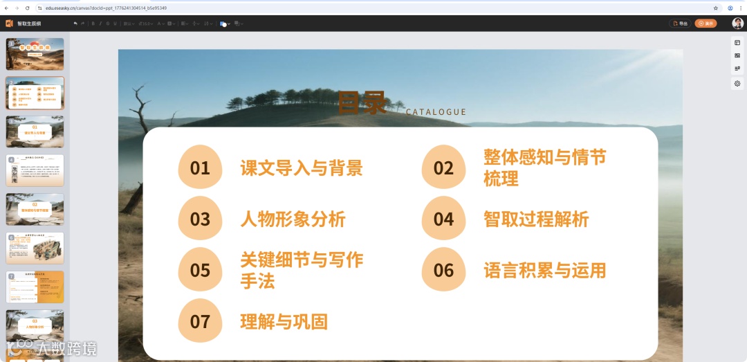 选择课文后,系统自动生成包含完整教学环节、可直接用于课堂讨论的专业课件初稿。