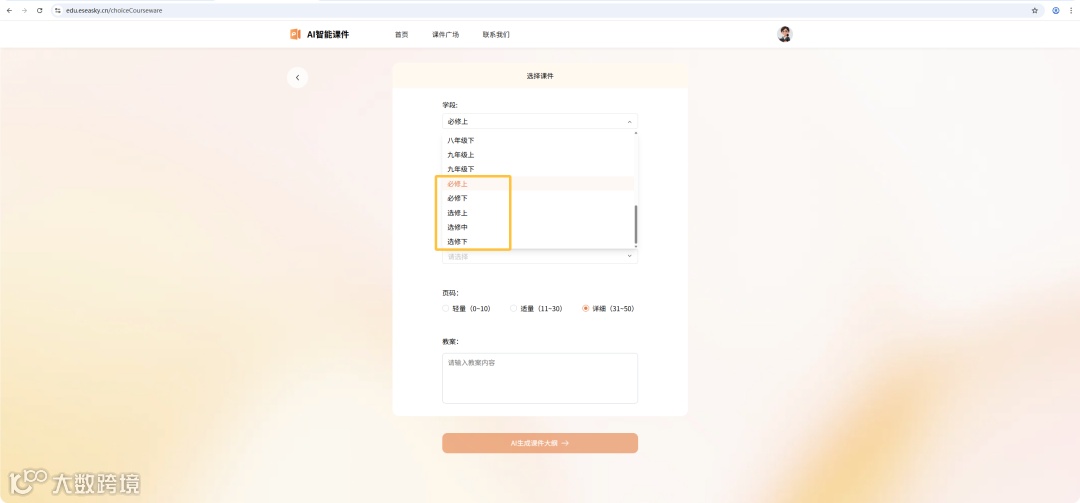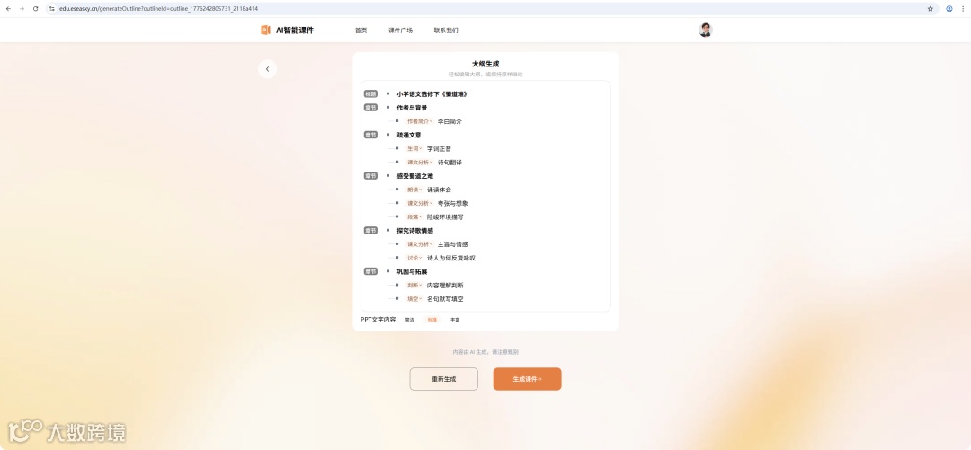 输入课文名称后,系统先梳理教学逻辑与重点;确认大纲后,自动生成匹配的完整课件。