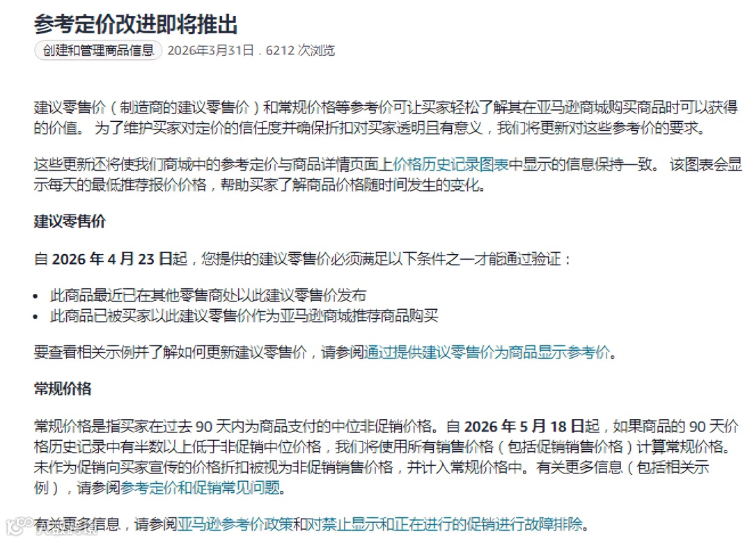 亚马逊官方宣布,自2026年4月23日起实施“参考价改进规则”,分两阶段执行。