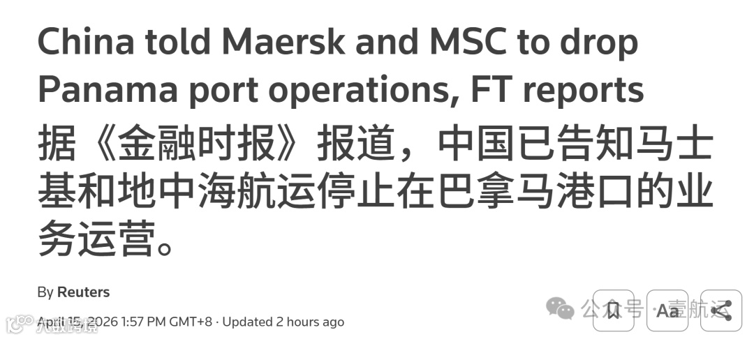 综合英国《金融时报》及路透社报道,4月15日披露,中国已正式要求丹麦航运集团马士基和瑞士地中海航运公司停止运营巴拿马运河的巴尔博亚港与克里斯托瓦尔港。