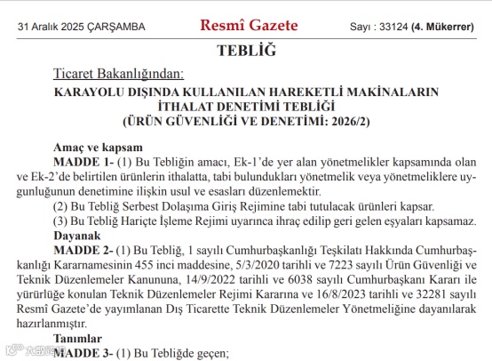 土耳其近期发布产品安全监管公告(2026/2),强化进口产品合规要求,工程机械被列为重点监管品类。