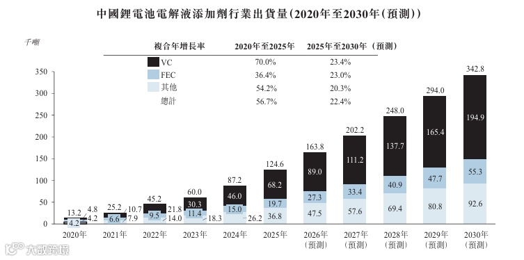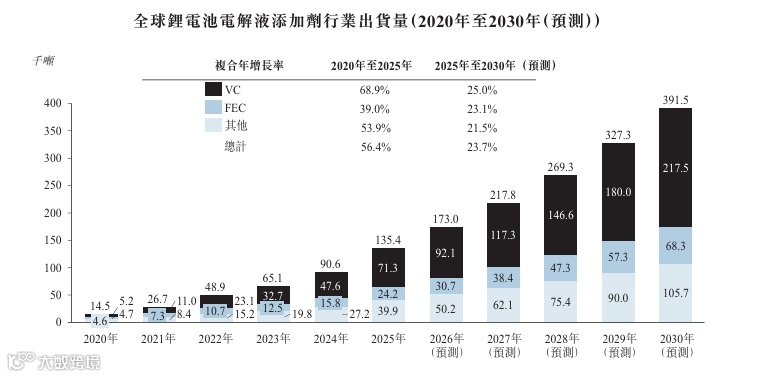 中国作为全球最大电解液生产国,2025年出货量187.72万吨(2020-2025年CAGR 50.4%),2030年预计达471.19万吨。VC/FEC作为核心添加剂品类,其市场增长尤为显著: