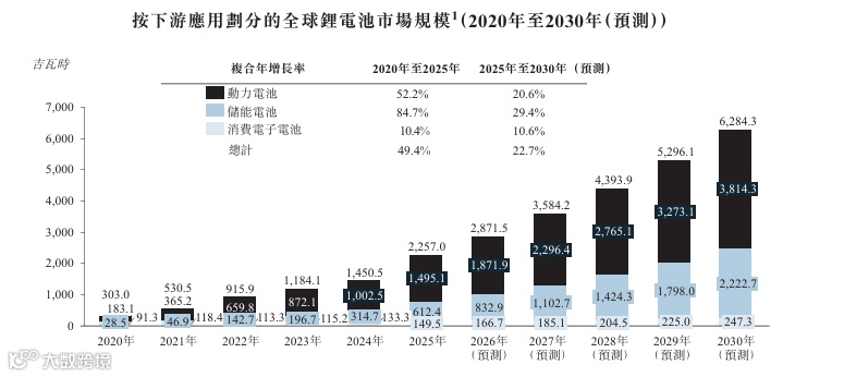 全球锂电池市场规模从2020年303.0吉瓦时扩张至2025年2,257.0吉瓦时,年均复合增长率49.4%。在碳中和目标驱动下,预计2030年将达6,284.3吉瓦时(2025-2030年CAGR 22.7%)。