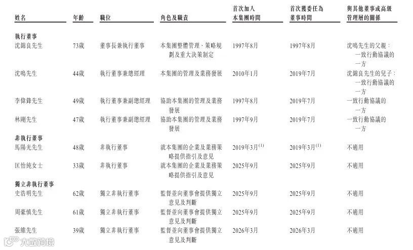 公司由沈氏父子控制,截至2026年4月7日,控股股东方合计持股60.2%。其中董事长沈先生直接持股11.3%并通过协议控制34.3%表决权,其子沈鸣持股7.4%(含间接持股)。董事会由4名执行董事、2名非执行董事及3名独立董事组成。