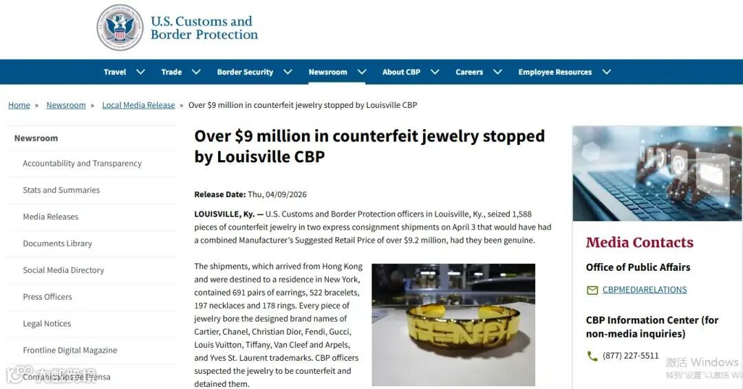 4月3日,美国海关与边境保护局(CBP)在肯塔基州路易斯维尔口岸查获1588件自香港发往纽约的假冒高端珠宝,包括691对耳环、522个手镯、197条项链及178枚戒指,仿冒卡地亚、香奈儿等9大奢侈品牌商标。