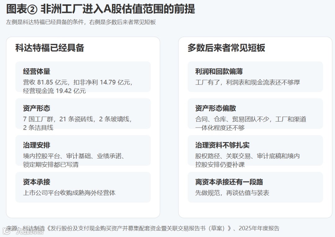 该交易为非洲制造资产证券化提供了可复制框架,明确四大门槛:稳定规模的利润与现金回款、清晰的境内外股权架构、合规审计底稿、明确的业绩承诺与股份锁定机制。A股对非洲制造的估值认可,凸显国内上市平台整合海外成熟经营体更具可行性。