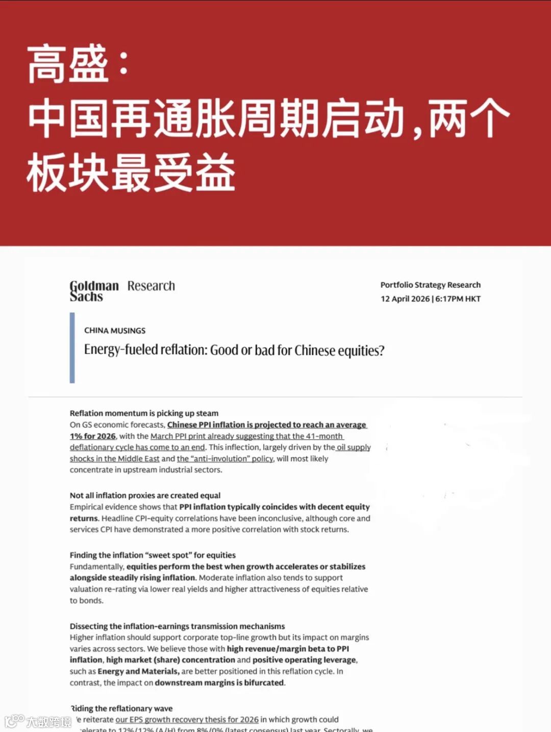高盛预测,中国结束41个月PPI通缩,进入温和再通胀周期(2026年PPI预计升至1.0%),主要受中东石油供给冲击和"反内卷"政策推动。此转变对A股港股整体利好,但行业分化明显:上游资源品(能源、材料)显著受益,下游消费尤其是食品饮料业将承压。投资者应采取"杠铃策略",布局上游通胀受益股与具备定价权的消费防御股。