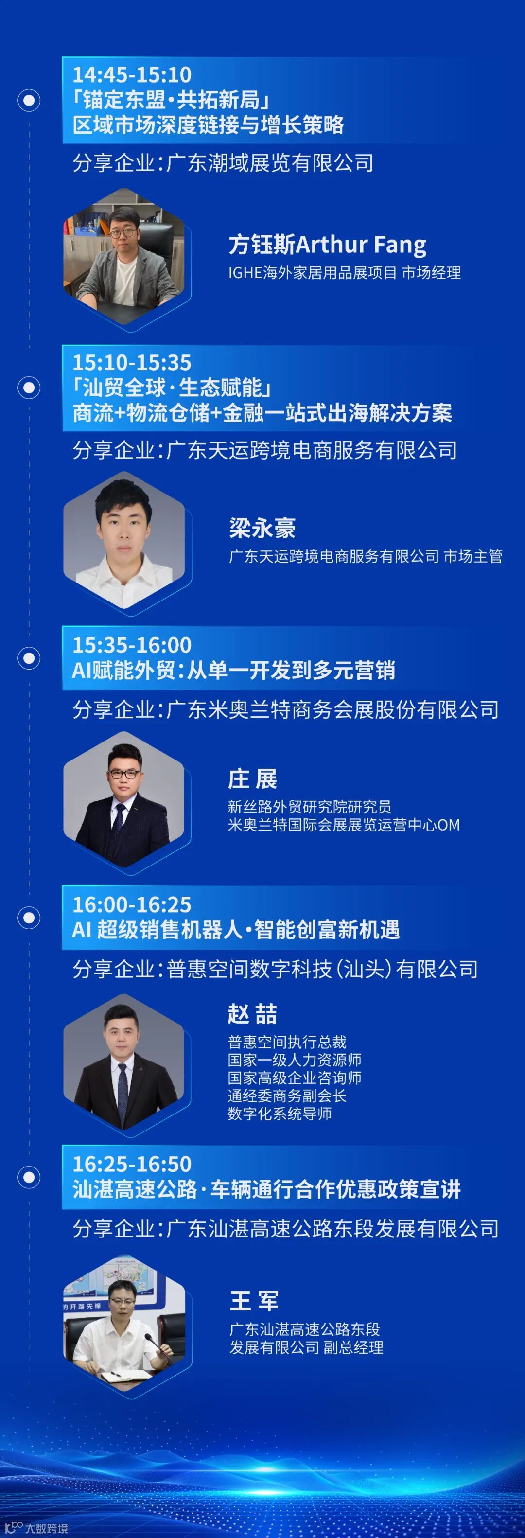 聚焦东盟市场开拓、跨境物流与金融赋能、AI数字化营销、智能销售工具及海关通行政策等核心议题,邀请外贸、跨境物流及数字化营销领域专家解析实操方案,搭建资源对接平台。