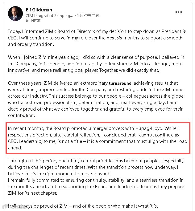 Glickman在LinkedIn解释称,他领导公司九年实现重要目标,但经慎重考虑无法支持董事会推进的与赫伯罗特(Hapag-Lloyd)合并计划,故决定卸任。