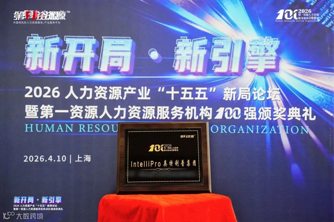 4月10日,2026人力资源产业"十五五"新局论坛暨第一资源人力资源服务机构100强发布盛典在上海举行,权威榜单正式揭晓。IntelliPro英特利普集团凭借综合实力、全球交付能力和技术创新优势,荣登"2026人力资源服务机构100强"榜单,跻身中国人力资源服务行业第一梯队。