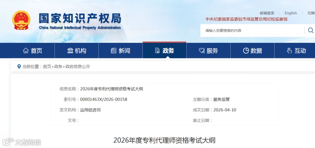 考试实行全国统一命题,命题范围以《2026年度专利代理师资格考试大纲》为准,大纲将发布在国家知识产权局政府网站“专利代理师资格考试”专题专栏。