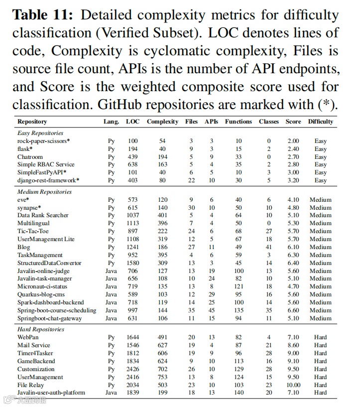 数据集包含106个仓库(60个Python,46个Java),覆盖18个领域、11套框架,含1258个API及2335项测试。其中30个经严格验证的仓库构成评测子集(含6个真实GitHub项目),76个用于训练。测试采用学术会议级质控流程,确保评分可靠性。