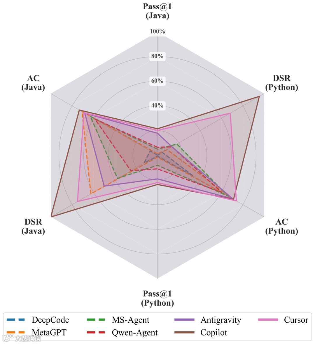 实验显示:接口覆盖率可达73.91%,部分配置部署成功率100%,但顶尖系统功能通过率仅23.67%(Python)和21.45%(Java)。这揭示核心瓶颈:跨文件一致性(50.2%失败主因)、架构连贯性(26.0%)及依赖管理(23.8%)仍是重大挑战,其中Java依赖问题更为突出(44.7%)。