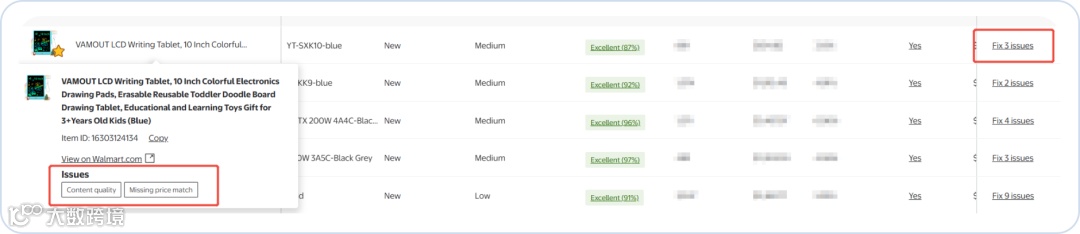 点击商品标题可查看具体问题,"fix issues"链接直达优化面板。