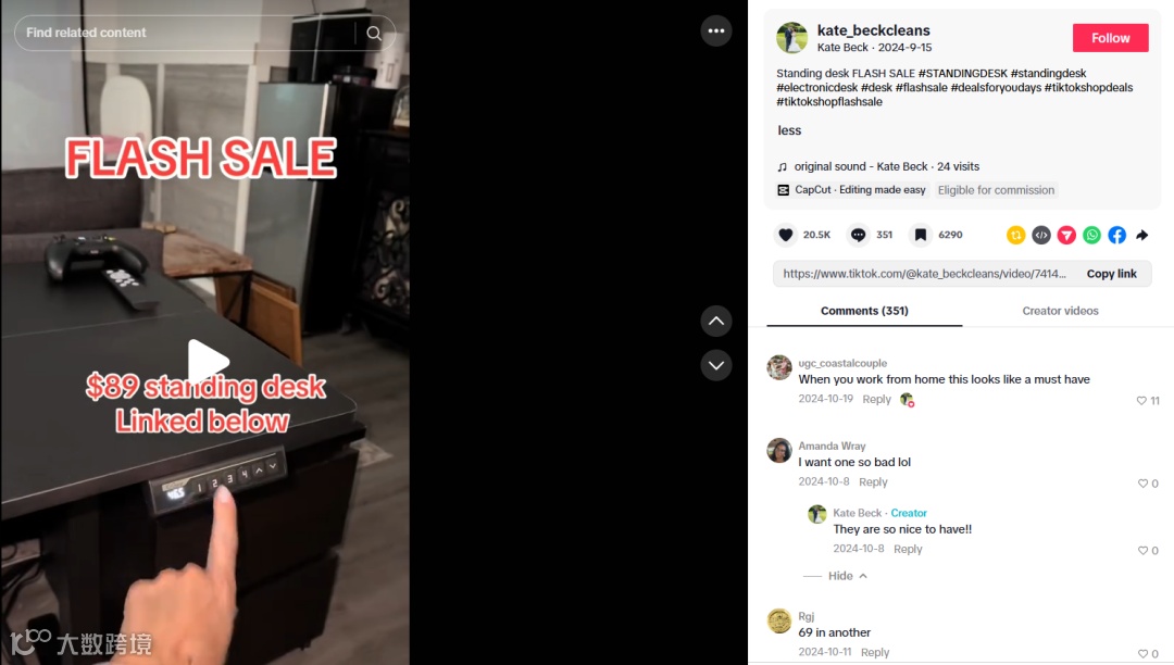 博主@pyegames视频展示产品后单日销量达1700件;素人博主@kate_beckcleans凭借350万播放量视频实现2000单销量、17.6万美元销售额,验证口碑裂变价值。