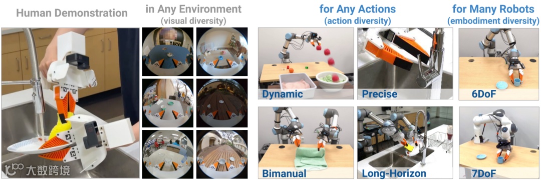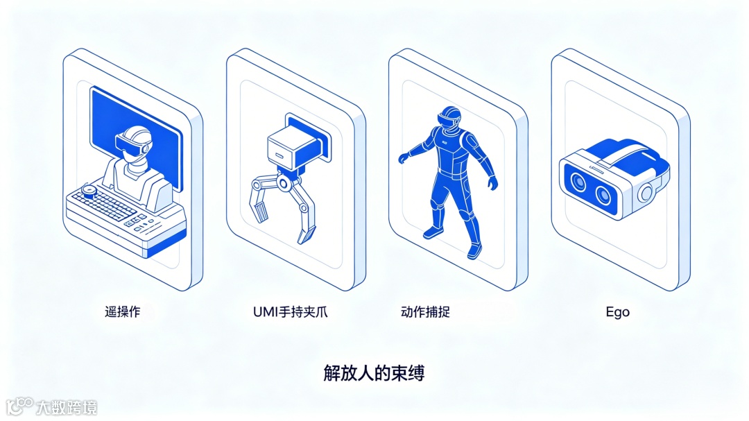 采用标准化手持夹爪在真实场景中操作,同步记录末端视角与运动信息。设备轻便且数据通用性强,但对操作员存在限制,难以完成精细操作,且缺失环境行走决策信息,多适用于机械臂而非人形机器人。