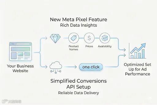 Meta宣布对其广告追踪系统进行两项重大升级:AI辅助的Meta Pixel优化和一键式转化API(CAPI)配置方案,旨在大幅降低技术门槛,让中小团队也能享受高效的数据回传服务。