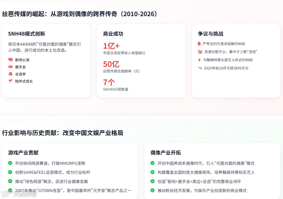 但高光之下,争议始终伴随。久游网曾因《劲舞团》社交生态被贴上低俗标签,丝芭传媒则因超长合约、高额违约金、资源分配不均屡遭质疑。王子杰极强的控制欲与理性商业思维,让公司在商业上获得成功,也在人文层面留下争议。晚年的丝芭传媒面对选秀综艺冲击、粉丝经济退潮、行业监管收紧,逐渐增长乏力,业绩下滑、资本撤离,与早年风光形成鲜明对比。