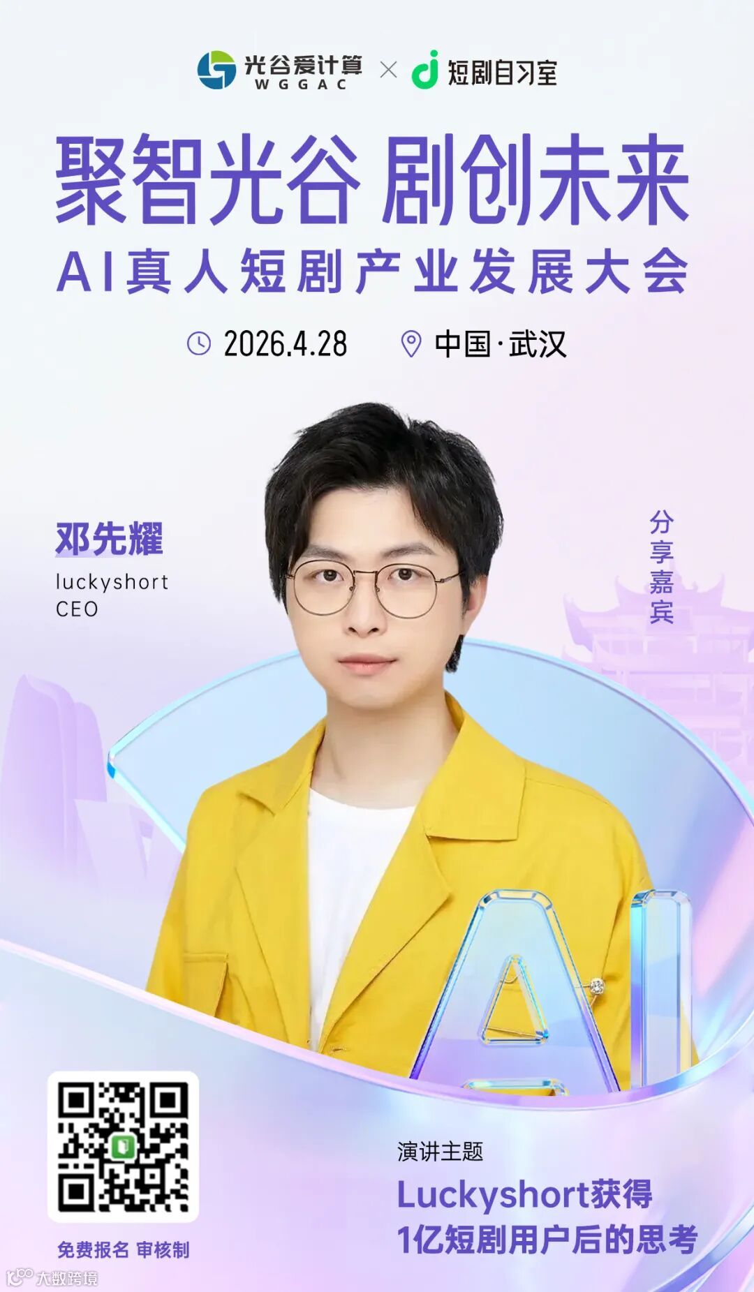 PS:欢迎扫描下方海报二维码,报名短剧自习室主办的“聚智光谷 剧创未来:Al真人短剧产业发展大会”,听LuckyShort创始人邓先耀现场分享。