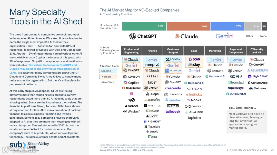 从这个角度看,报告第 23 页给出的市场图谱很有意思。在客户支持板块里,Zendesk 是被最多提及的 AI 客服系统解决方案平台,与 Gemini、Intercom、Claude、ChatGPT、Crescendo、Decagon 等一起,构成当前企业客户服务 AI 的主要选项。这个信号至少说明一件事:在 CFO 和管理层视角里,客户服务 AI 的竞争,已经不是单一模型之争,而是谁更能进入真实服务流程、谁更像一个平台能力。