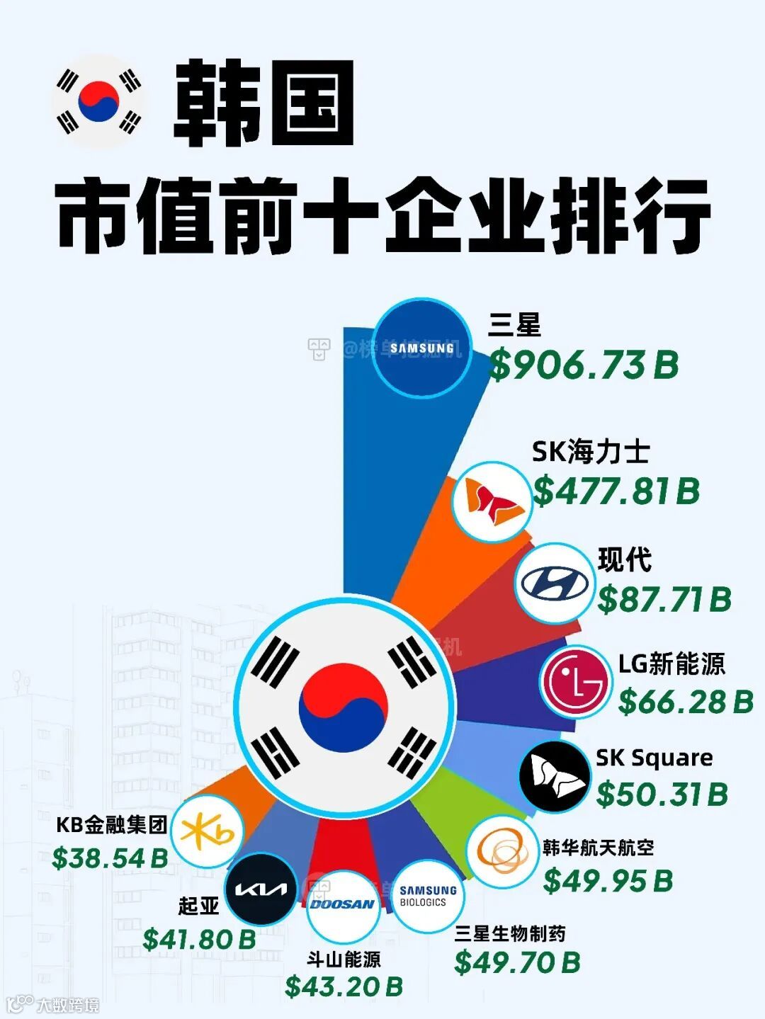 截至 **2026 年 4 月中旬**,韩国市值靠前的一批公司里,最有代表性的还是三星电子、SK 海力士、现代汽车、LG 新能源、韩华宇航、三星生物制剂、SK Square、斗山能源、KB 金融、起亚这一组。这个榜单不是拿来凑热闹的,它其实已经把韩国接下来几年最想守住、最想做大的产业方向,摊在台面上了。