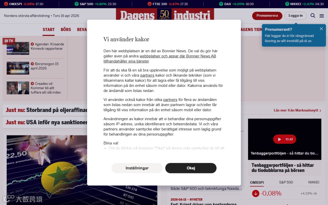 瑞典最大的商业和财经日报,被称为瑞典的"金融时报"。Dagens Industri提供瑞典及北欧的股票市场、企业并购、行业动态资讯。关注其企业版块,可以及时获知瑞典大型企业的战略动向、扩产计划和新建项目,是捕捉商业机会的重要信息来源。