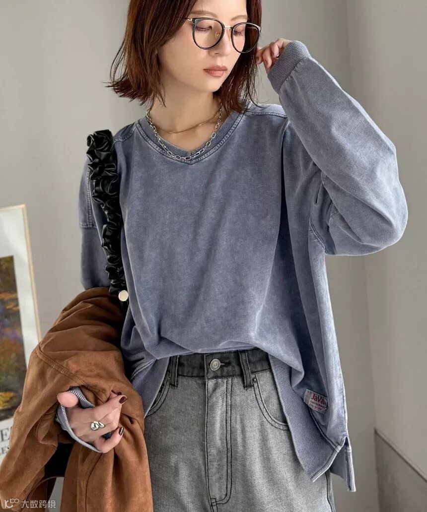 日系小红牌Java复古水洗V领长袖T恤